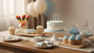یک جشن موفق تنها به تزئینات محدود نمیشود. کیک، شیرینیها و خوراکیها باید با تم جشن هماهنگ باشند. مثلاً کیک با رنگهای اصلی تم یا کوکیهای ساده با طرح شخصیت محبوب کودک، باعث میشود دیزاین تولد پسرانه ساده کامل و هماهنگ دیده شود.